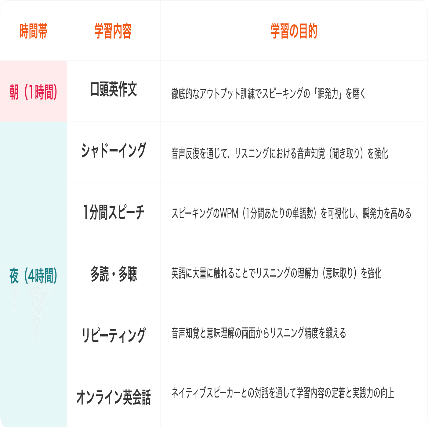 南さまは基礎が完璧に固まっているからこそ、通常のカリキュラムをそのまま当てはめるのは非効率だと判断しました。そこで、あえて「単語学習」などのインプットをゼロにし、その分をすべて「口頭英作文(文章構成の自動化)」や「シャドーイング(音声知覚の強化)」などの運用学習に振り切る提案をしました。