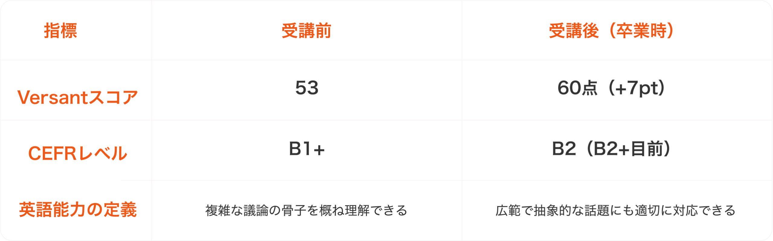 その誠実さが信頼に繋がりました。おかげで、「この3ヶ月で終わるのではなく、この先数年続く学習の土台を今作るんだ」という、長期的な覚悟が決まりました。結果として、Versantのスコアも53点から60点へと、驚異的な伸びを見せることができました。
