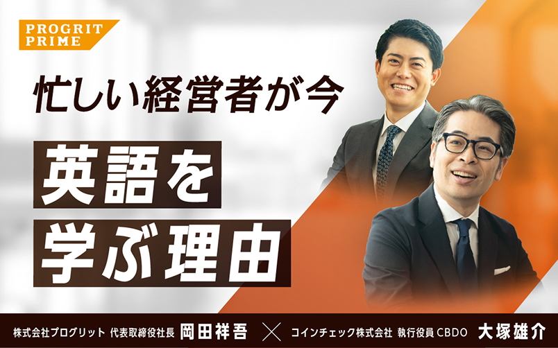 PROGRIT PRIMEは、プログリット代表の岡田が、世界で活躍する日本のビジネスリーダーの皆様に、「なぜ今、英語を学ぶのか」、その背景や想いを伺う番組です。第1回ゲストは、暗号資産取引所サービスを提供するコインチェック株式会社 執行役員の大塚雄介氏。本記事では、対談の一部を抜粋しお届けしています。